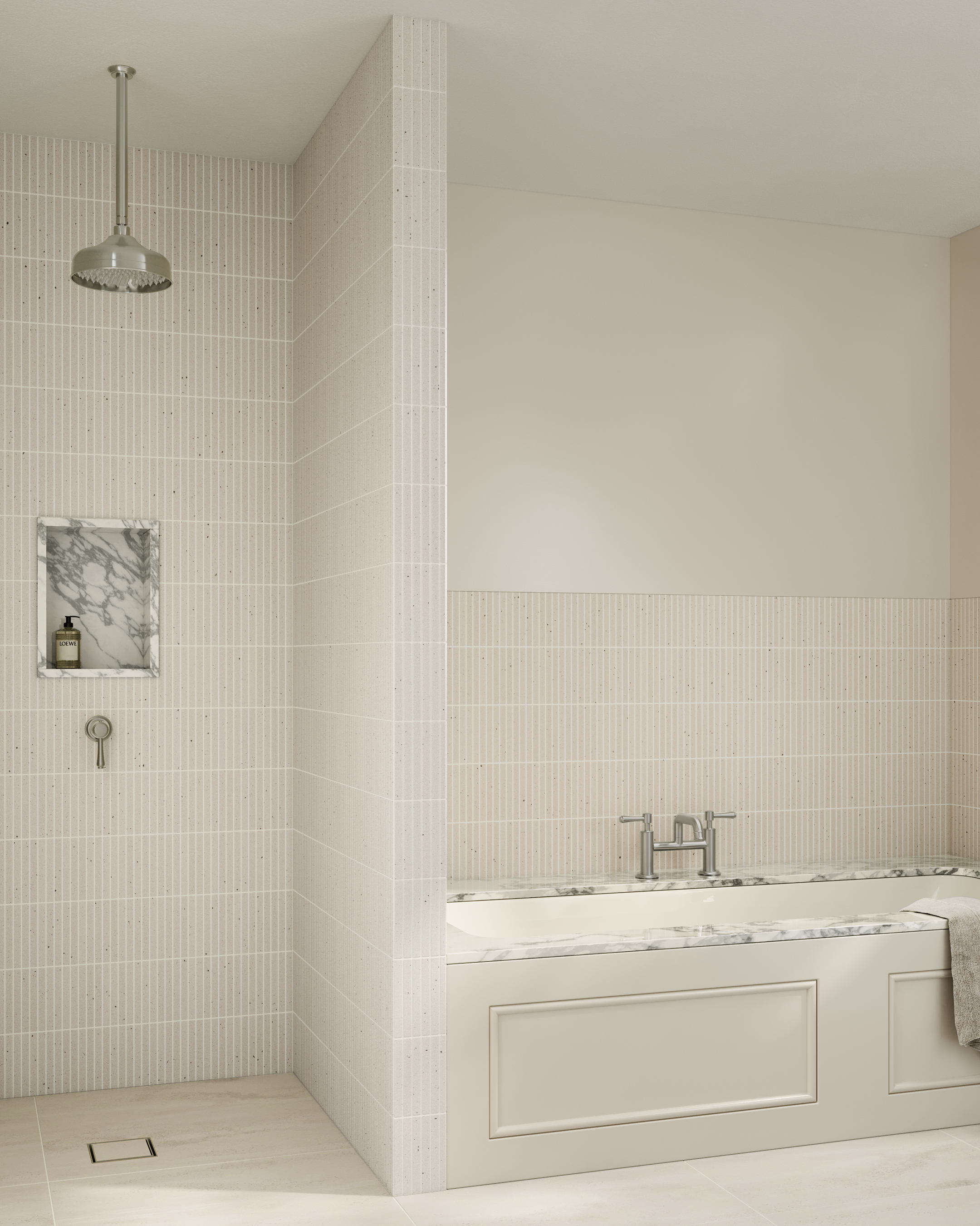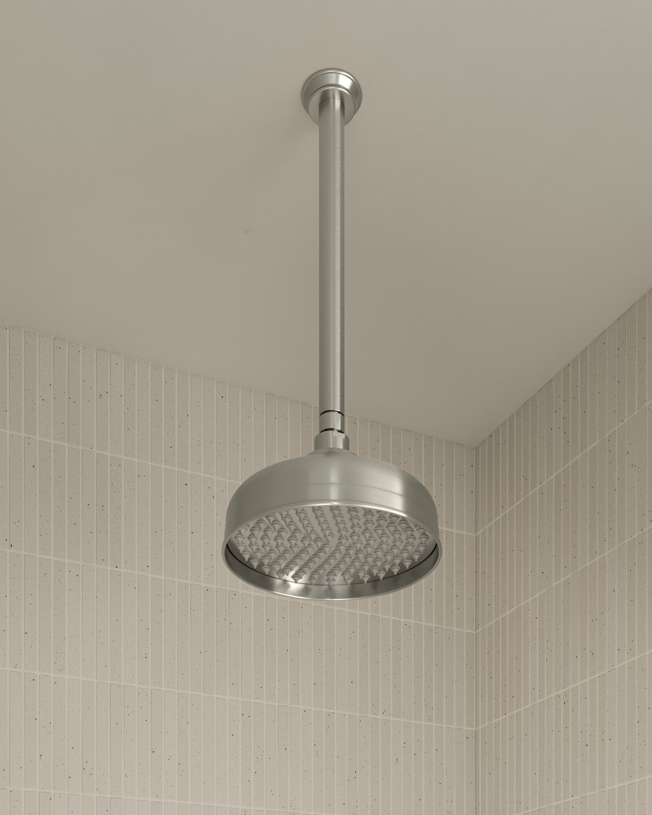 The ceiling-mounted Shower Dropper and Head Set from the Kingsley Collection inspire exceptional luxury.
