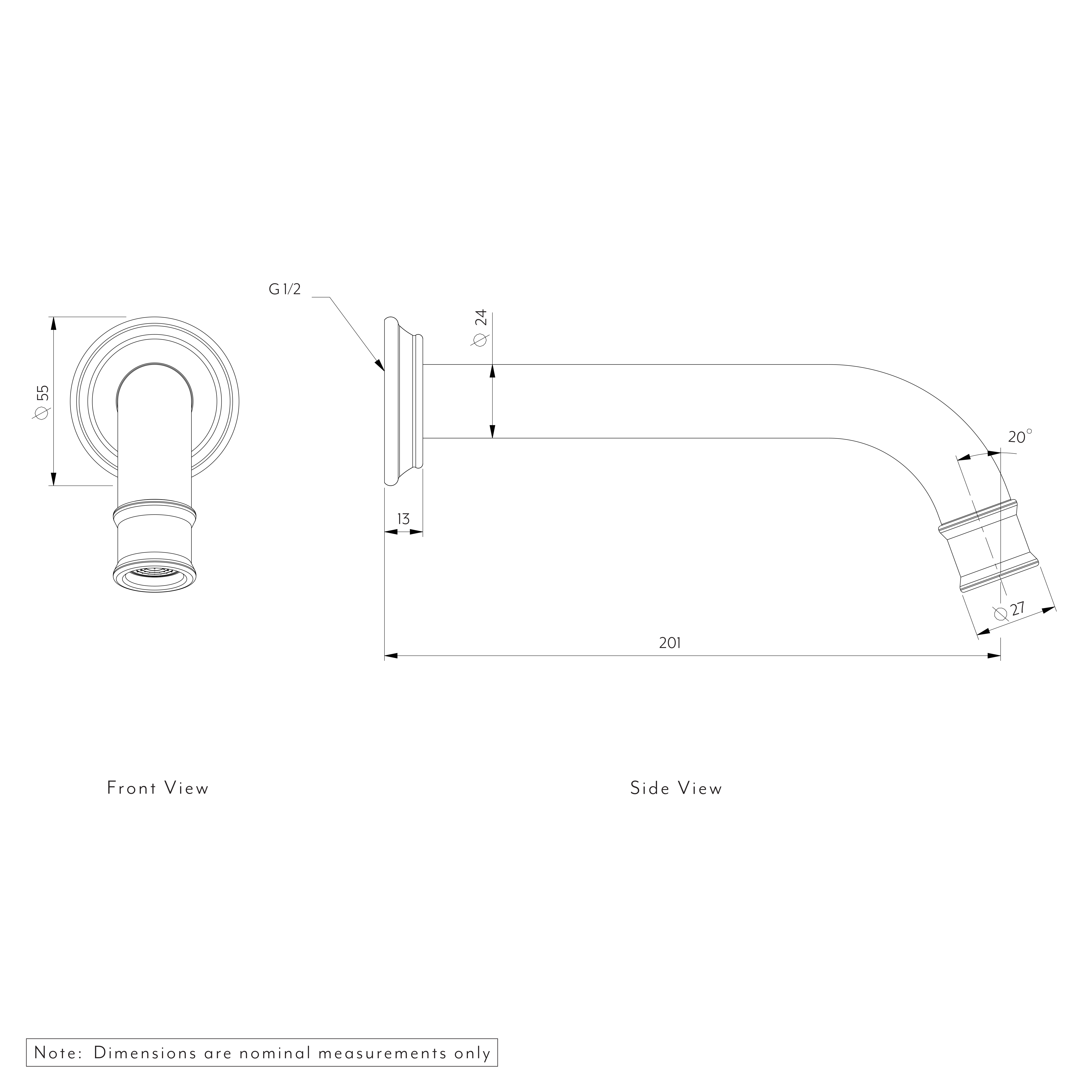 | Dimensions | Reach: 201mm Spout Body Diameter: 24mm Back Plate Diameter: 55mm |