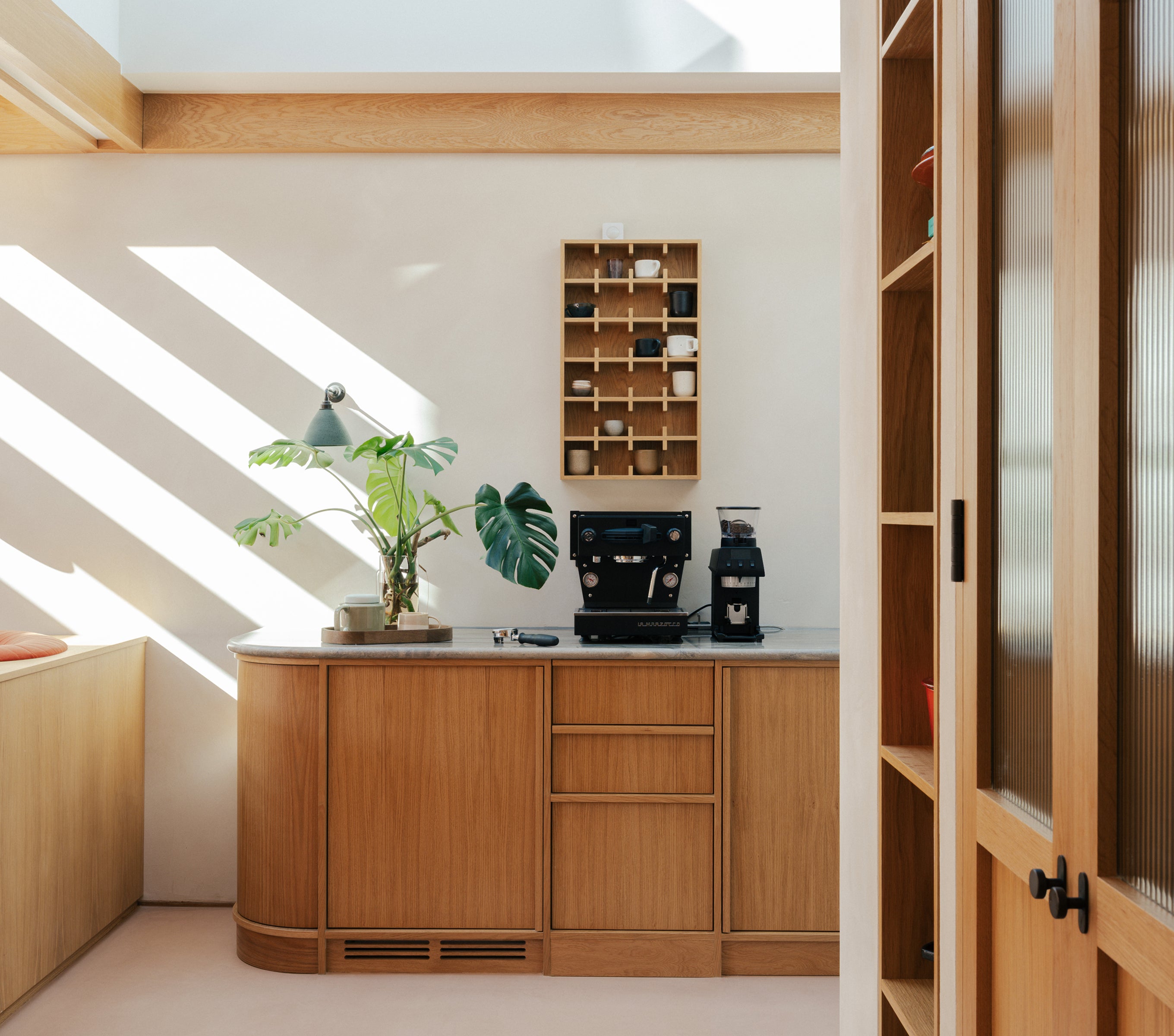 The kitchen and living areas follow the same careful attention to detail. A curved oak island with marble benchtop anchors the space, while bold built-in seating and generous skylights enhance both form and function. Throughout, ABI’s brushed copper fittings contribute to a cohesive, refined interior palette.