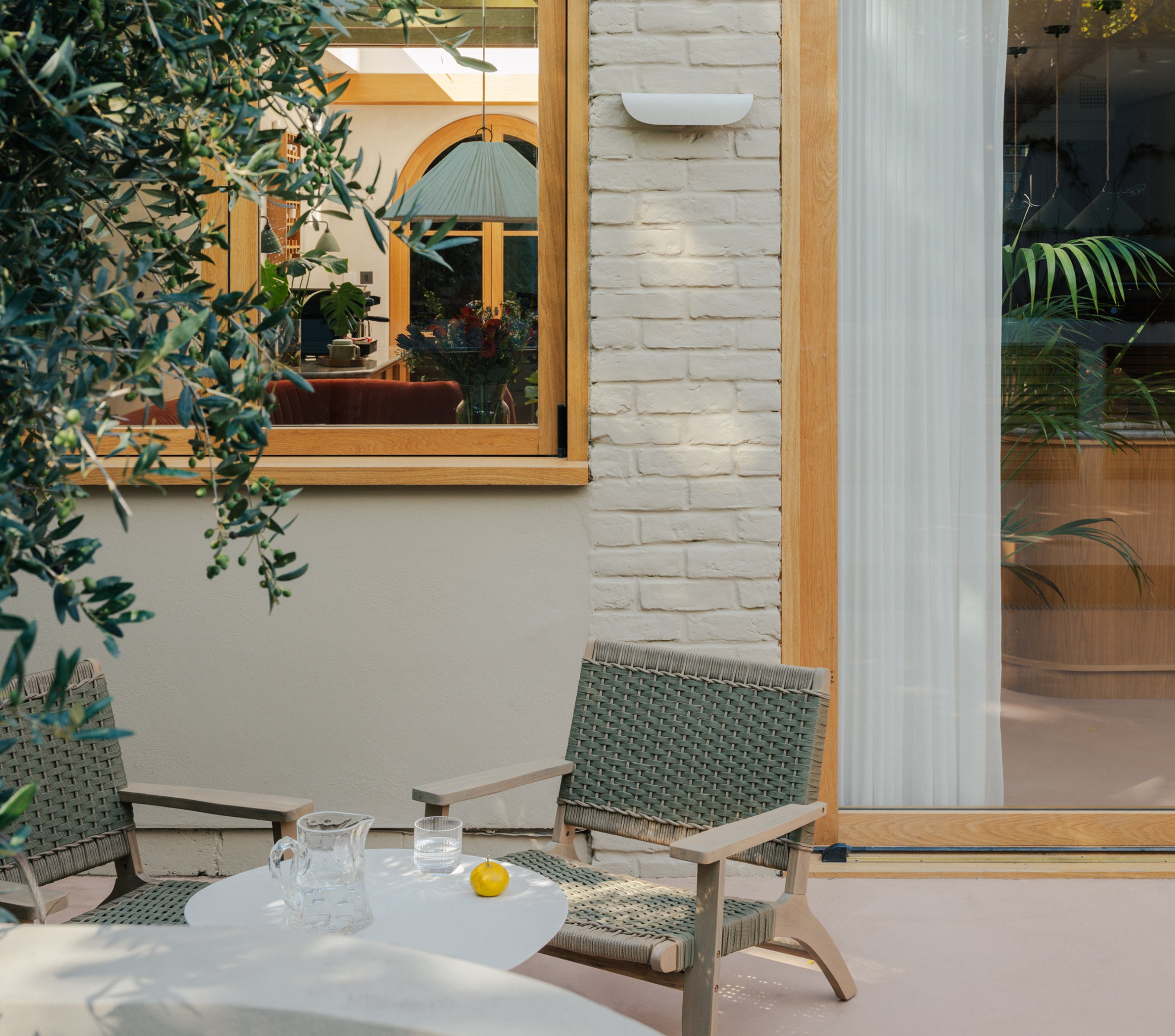 Timber-framed doors connect indoor spaces to a private courtyard, enhancing natural light and airflow throughout the home.